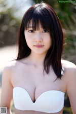 A woman in a white shirt and black skirt sitting on a bathtub.