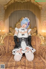 A woman in a red and white outfit sitting on a rug next to a Christmas tree.